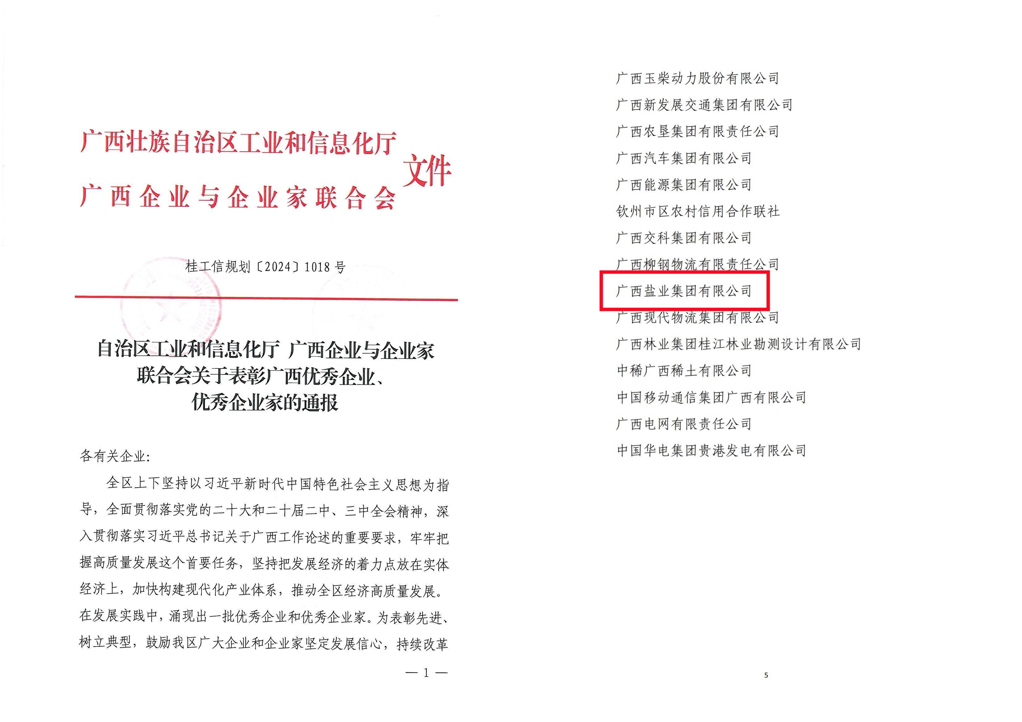 近日,自治區(qū)工業(yè)和信息化廳正式公布2024年廣西優(yōu)秀企業(yè)、優(yōu)秀企業(yè)家評比表彰結果。廣西鹽業(yè)集團在眾多企業(yè)中脫穎而出,再次獲評“廣西優(yōu)秀企業(yè)”榮譽稱號。