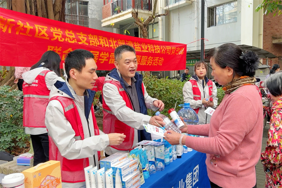 廣西北部灣鹽業科技有限公司黨支部積極響應號召,深入南寧市心圩街道創新社區開展學雷鋒志愿服務活動,將健康用鹽知識送到了群眾百姓身邊。南寧分公司黨支部為長者食堂捐贈低鈉鹽,科普低鈉用鹽理念。柳州鹽業有限公司黨支部開展愛心義診活動,通過健康知識宣講、趣味互動問答等形式,向少數民族群眾普及慢性病預防知識,架起民族團結“連心橋”。